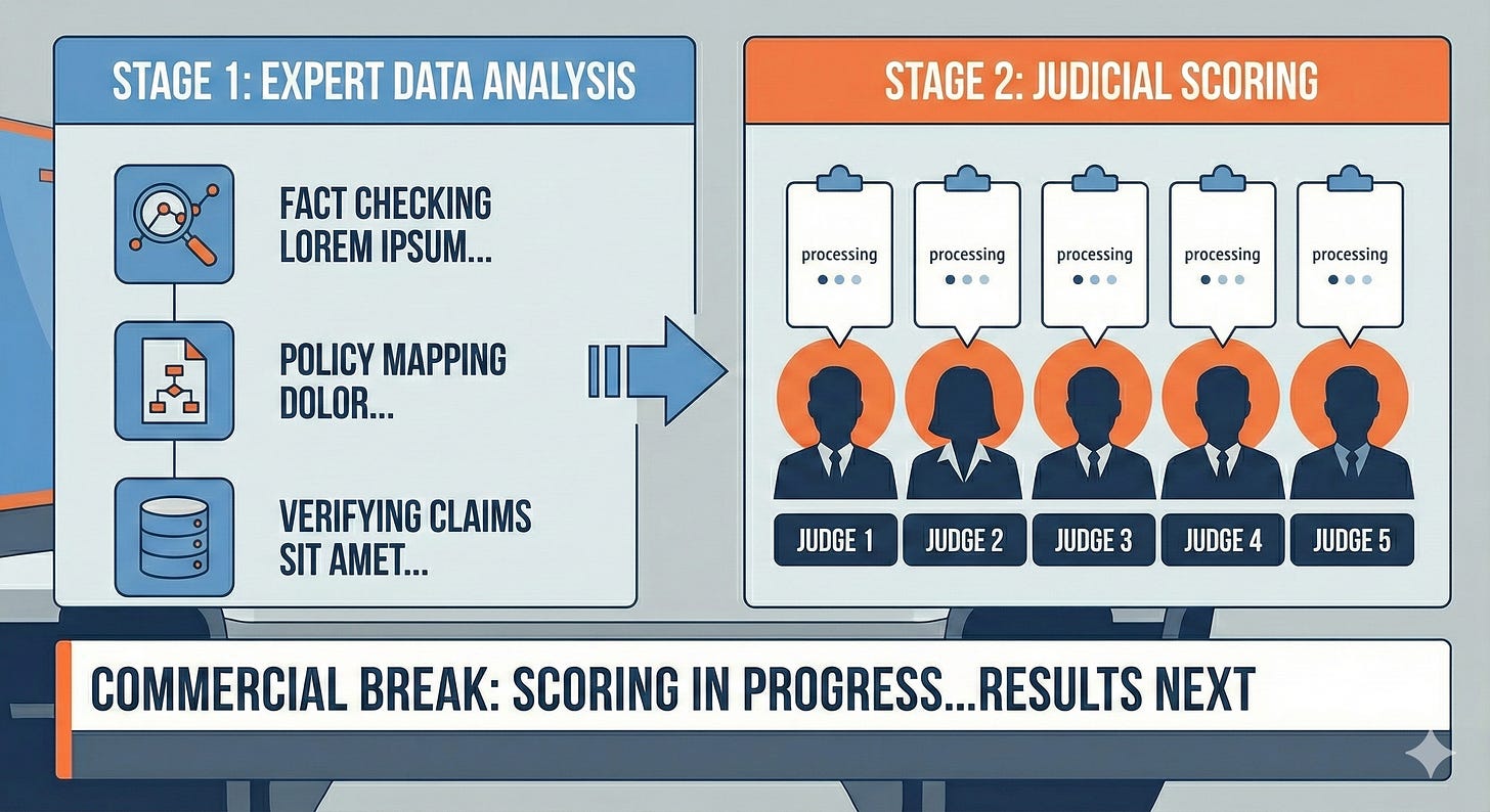 We already know how to do this. Every Sunday, millions of Americans watch referees make split-second calls about what counts as a catch, whether a player’s feet were in bounds, if someone was offsides. Every four years, we watch Olympic judges hold up scorecards evaluating gymnastics routines and figure skating performances, accepting that multiple judges with disclosed expertise can evaluate both technical precision and artistic merit. We’ve built elaborate systems—with instant replay, challenge flags, clear scoring rubrics, and transparent judging panels—that filter out invalid plays and score complex performances in real time. We understand that fair evaluation requires transparency, expertise, and accountability. We accept that in a fair competition, accuracy matters more than entertainment.