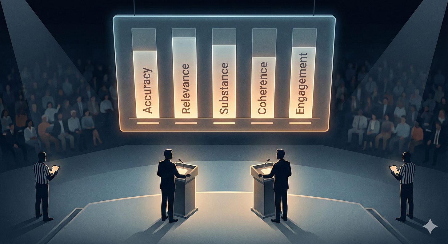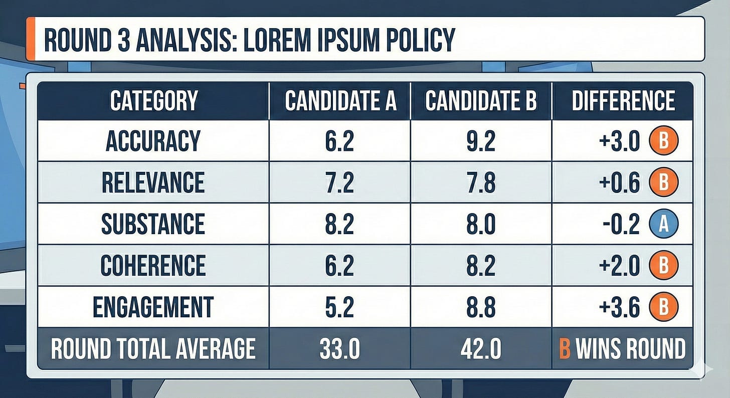 If you’ve made it this far, you probably agree that presidential debates could be better. Maybe you’d design the system differently than I would. Maybe you think we need 8 judges instead of 5, or different scoring categories, or a different format entirely.
